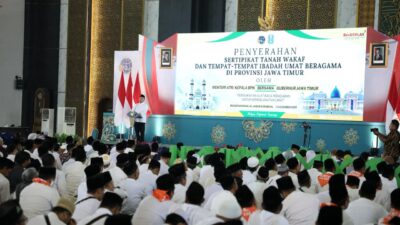 “Di Jawa Timur, tanah wakaf biasanya belum menjadi isu sebelum ada Proyek Strategis Nasional karena nilainya belum signifikan. Tapi, ketika proyek itu muncul, tanah wakaf kerap memicu sengketa karena adanya perebutan. Karena itu, bapak-bapak sekalian, mumpung hal itu belum terjadi di Jawa Timur, mari kita wakafkan dan sertipikatkan tanah-tanah wakaf ini,” imbau Menteri Nusron.