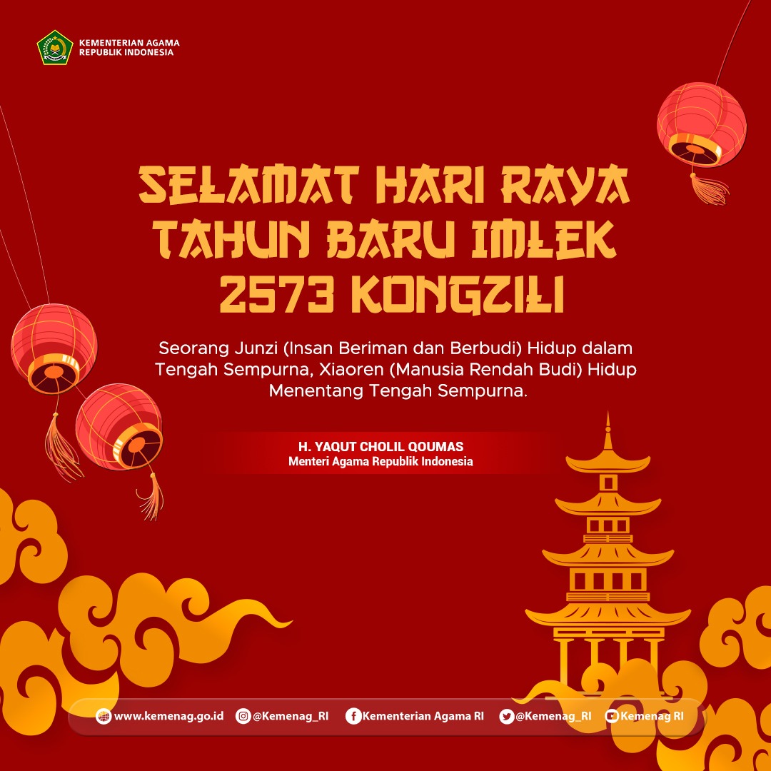 JAKARTA (NTBNow.co)–Menteri Agama Yaqut Cholil Qoumas mengucapkan selamat tahun baru Imlek 2573 Khongzili, Gong He Xin Xi, Wan Shi Ru Yi kepada seluruh umat Khonghucu di Tanah Air dan seluruh warga masyarakat yang merayakannya.